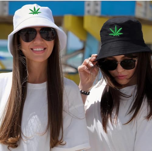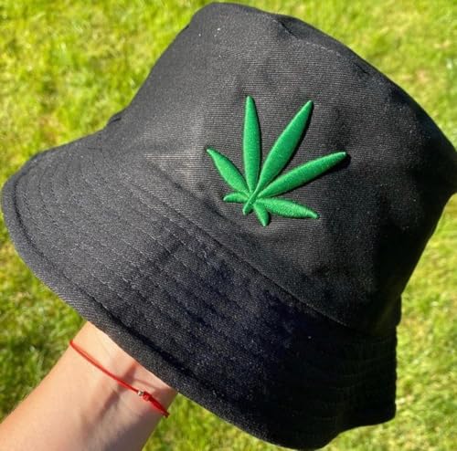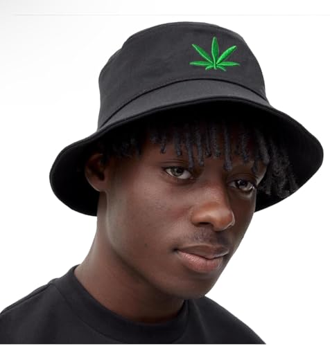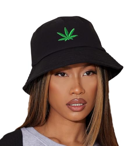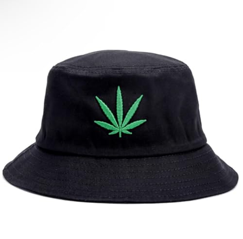 Generic - Unisex Black Bucket Hat with Embroidered Leaf Design, Summer Cotton Sun Hat