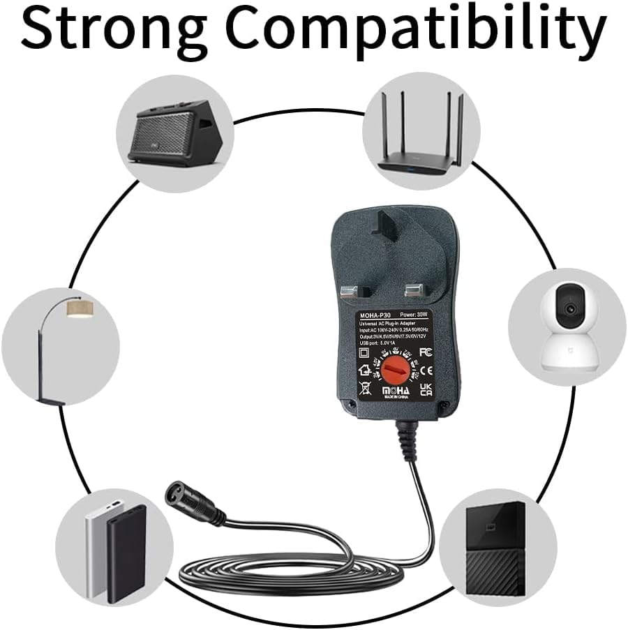 - Versatile Power Output: Adjustable voltage selector allows you to switch between 3V, 4.5V, 5V, 6V, 7.5V, 9V, and 12V to power a wide range of electronic devices with a maximum output of 30W