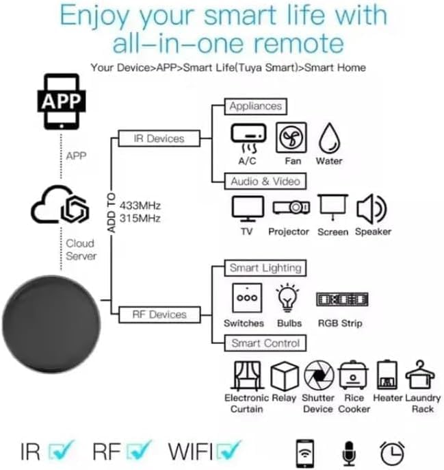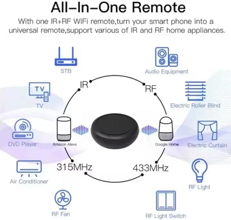- 1- Support IR / RF 2 2-Support 433 / 315 frequency 3-Easy distribution network 4- APP remote control 5-Support air conditioning, TV, Fan and TVBOX 6-Infrared Function can expand more control (38KHz) 7- 360 degree wide infrared signal coverage- Support Alexa and GoG assistant For 9-Smart TUYA APP