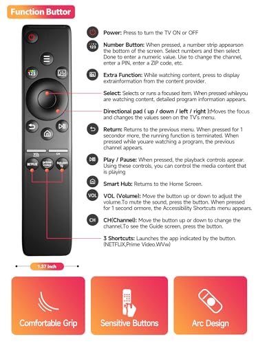 - 【REMOTE COMPATIBILITY】 Compatible with remote models: BN59-01266A, BN59-01312A, BN59-01312G, BN59-01310A, BN59-01259E, BN59-01330A, BN59-01329A, BN59-01298A, BN59-01298H, BN59-01292A, BN59-01241A, BN59-01293A, BN59-01357A, BN59-01199F, BN59-01301A, BN59-01315A, BN59-01289A etc.