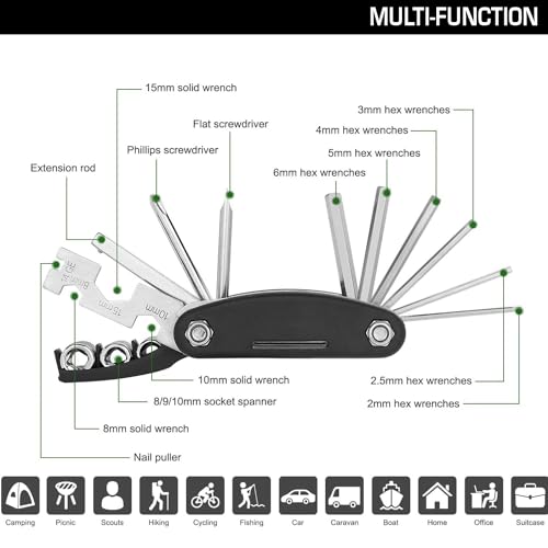 - مجموعة شاملة 16 في 1: مجموعة أدوات إصلاح الدراجات الكل في واحد مع مفكات براغي ومفاتيح ربط ومفتاح ربط وسحب مسامير وقضيب تمديد.