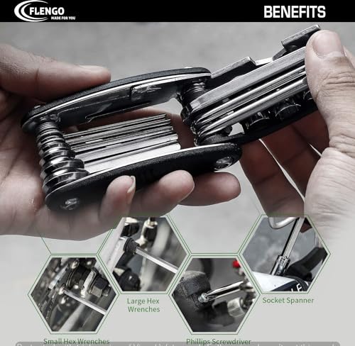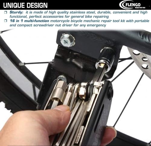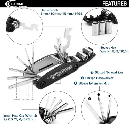 FLENGO; MADE FOR YOU - اطلق العنان لمغامرات ركوب الدراجات بدون خياطة مع مجموعة أدوات إصلاح الدراجات المصنوعة من فلينجو - مجموعة متعددة الأغراض 16 في 1 للصيانة والإصلاحات أثناء التنقل!