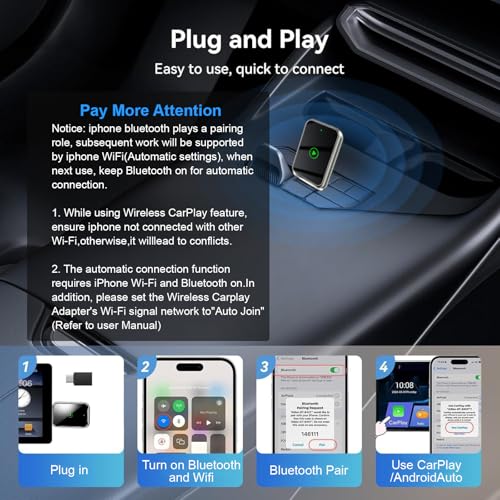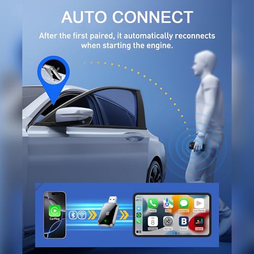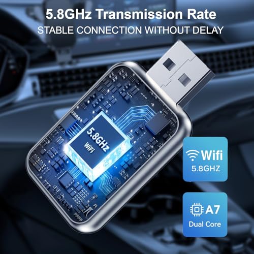 - Lightning-Fast Connectivity: Our wireless carplay adapter is equipped with the latest 5.8 GHz WiFi, Bluetooth 5.4+2.4GHZ, and a next-gen chip. Complete the first connection in 10s and auto-connect in 3s with zero daily usage delay. Experience transmission speeds 3 times faster than other adapters. Once paired, the android auto wireless adapter automatically reconnects every time, whether your phone is in your pocket, backpack, or outside the car. Enjoy the convenience of seamless connectivity with just one setup!