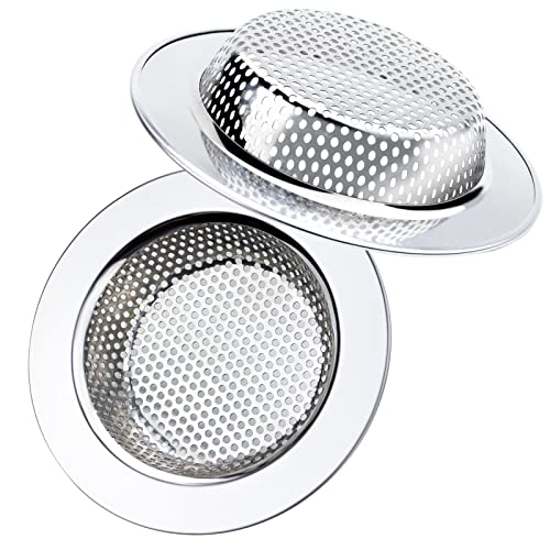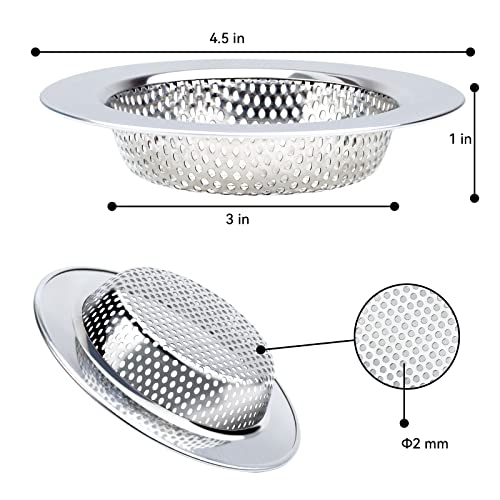 - 【ONE SINK STRAINER FIT MOST SINK】Our package contains 2 pcs sink drain strainers. Outer diameter: 4.5”; inner filter: 3”; depth: 0.9”, compatible with most standard sink drain and garbage disposals. Perfect sink accessories to keep hair, residues, and debris from clogging your sink drain, enjoy life and stay away from the trouble of sewer blockage