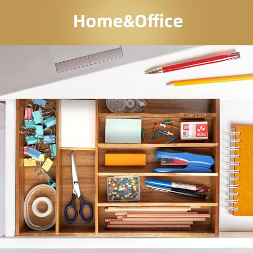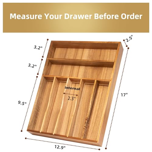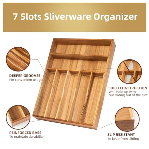 - ✅【Keep Your Home Tidy】This beautiful 7-compartments cutlery organizer has 2" deep compartments and can be placed into any drawer or desktop, which helps you to see everything at a glance and keep away from messy. The perfect space-saving acacia wood silverware organizer helps you to reach the desired item that you are looking for. Whether you are looking for your favorite knife or spoon, this utensil organizer makes it completely simple. We highly recommend to measure your drawer before order.
