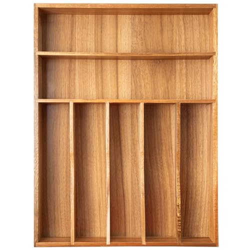 - ✅【Sturdy and Well-made】Our acacia wood silverware tray for drawer is made of natural acacia with the age of over 4 years, which makes the silverware holder durable enough for long time use. The environmental material keep our flatware & utensil water and odor resistant. Even the knife won't leave scratch on it. Unlike the plastic and metal drawer organizer, our silverware tray more classic and natural, the color and texture of the kitchen drawer organizer is 100% natural and even.