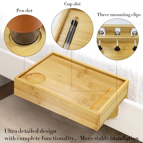 upcessory - رف منظم وطاولة بجانب السرير من الخيزران بمشبك تثبيت ودرج وقاعدة للأكواب وفتحة للأسلاك من ابسيسوري، لون خشبي