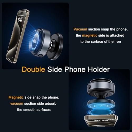 - Dual-Side Attachment: Designed for versatility, this phone mount combines vacuum suction + magnet to firmly attach to smooth surfaces like glass, mirrors, and marble, as well as metal surfaces like gym equipment and refrigerators.
