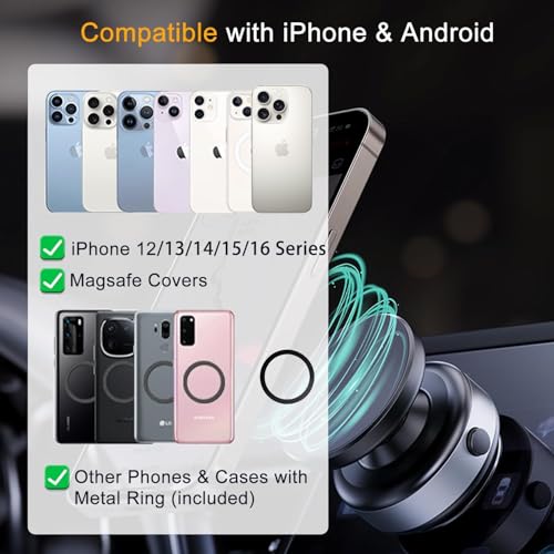 - Strong Magnetic Grip & Universal Compatibility: Designed for MagSafe iPhones (16/15/14/13/12 series) and comes with a metal ring for non-MagSafe phones. Attach the metal ring to your device or case and allow 24 hours for maximum adhesion.