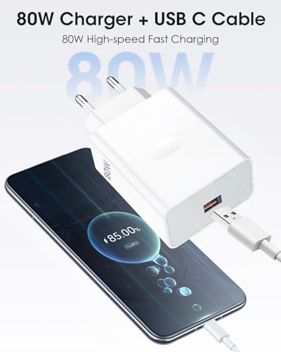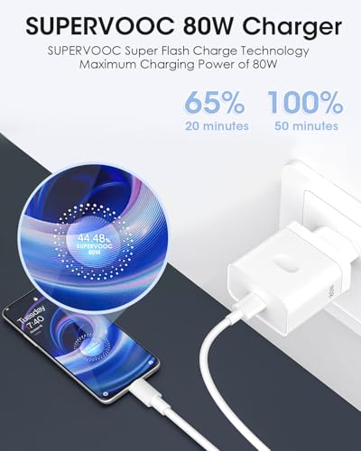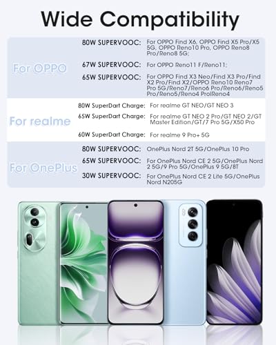 - Wide Compatibility with OPPO and Realme Devices: This SUPERVOOC 80W charger and USB-C cable is perfect for a variety of devices, including OPPO Find X6, Find X8 Pro, Reno 13, 12 Pro, A98, and Realme GT Neo 3 models. It is also compatible with OnePlus devices and other brands that support fast charging.