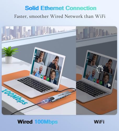 - 【USB C Ethernet Adapter】: This USB C Docking Station euiped with a RJ45 Ethernet port, Supports 10/100/1000Mbps speed.It provides faster and more stable nework data transfer and better security than most Wi-Fi connections.