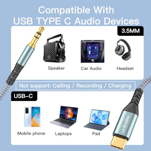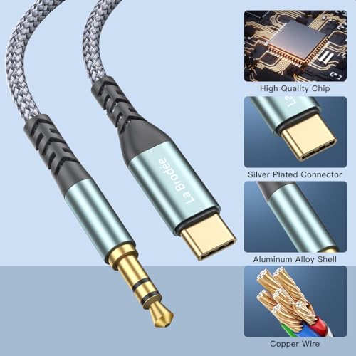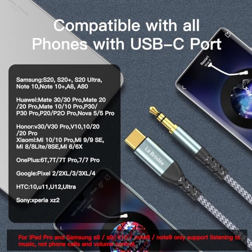 La Brodée - USB C to 3.5mm Audio Aux Jack cable, Type C adapter to 3.5mm male headphone stereo cable car compatible with iPad Pro 2020 Google Pixel 3 4 XL, Samsung Galaxy S22 S21 S20 Ultra Note 20
