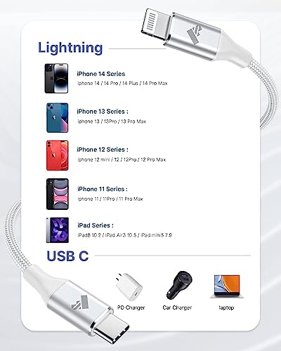 - [Fast Charge Compatibility for USB C to Lightning]: This iPhone charger charging cable is compatible with iPhone 14/ 14 Pro/ 14 Max/ 14 Pro Max/ 13/ 13 Pro/ 13 Pro Max/ 13 mini / 12/ 12 Pro Max/ 12 Pro Max/ 12 mini/ XR/ XS Max/ XS/ X, iPhone 11/ 11 Pro/ 1 Pro1 Pro Max/ 10/ 8/ 8 Plus, iPhone SE 2020, iPad Air 3, iPad mini 5, iPad Gen8, iPad Pro 12.9" Gen1/Gen2, iPad Pro 10.5"
