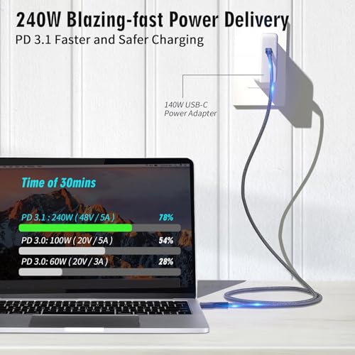 - 240W PD 3.1 FAST CHARGING CABLE - 240W USB C to USB C cable is an upgraded fast charging cable that supports PD3.1 up to 48V 5A (max) and is backward compatible with lower power requirements of 180W, 140W, 100W, 60W and below, allowing you to Charge any of your own devices quickly. Type C cable features an E-Marker certified USB IF smart chip that intelligently adjusts current and voltage for