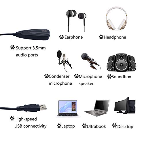 - ✪【USB External sound card】:It is a highly flexible audio interface which can be used wither with desktop or laptop systems. It by passes the faulty sound card or the broken audio jack of your computer to regain its audio function. Or as a replacement for a broken USB audio adapter.Avoid the hassle or save the high cost of fixing your computer.