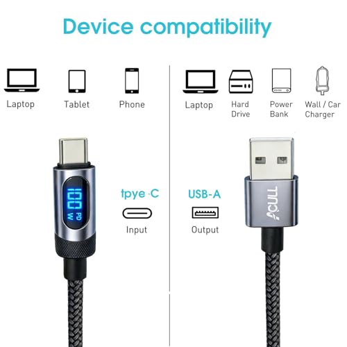 - 【Smart Power Display & Safety Chip】Monitor charging power in real time with the LED digital display on this usb a to usb c cable. The built-in intelligent chip adjusts voltage and current automatically, ensuring safe and efficient charging without overheating or overvoltage. (Note: Display shows charging power only and does not affect speed.)