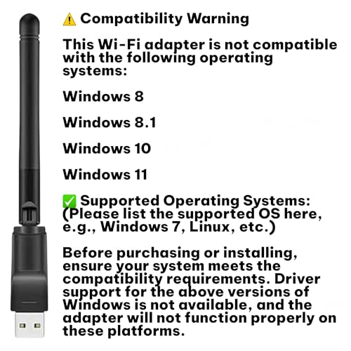- ⚠️ ملاحظة هامة حول التوافق: لا يعمل محول الواي فاي هذا مع أنظمة التشغيل التالية: ويندوز 8 وويندوز 8.1 وويندوز 10 وويندوز 11✅ الأنظمة التي يدعمها الجهاز: ويندوز 7 وفيستا واكس بي وماك او اس ولينكس وراسبيري باي وباي 2 و3 و4 وباي زيرو دبليو تأكد من أن جهازك متوافق مع المنتج قبل الشراء أو التثبيت. لا تتوفر تعريفات المحول لإصدارات ويندوز المذكورة ولذلك لن يعمل المحول بكفاءة على هذه الأنظمة.