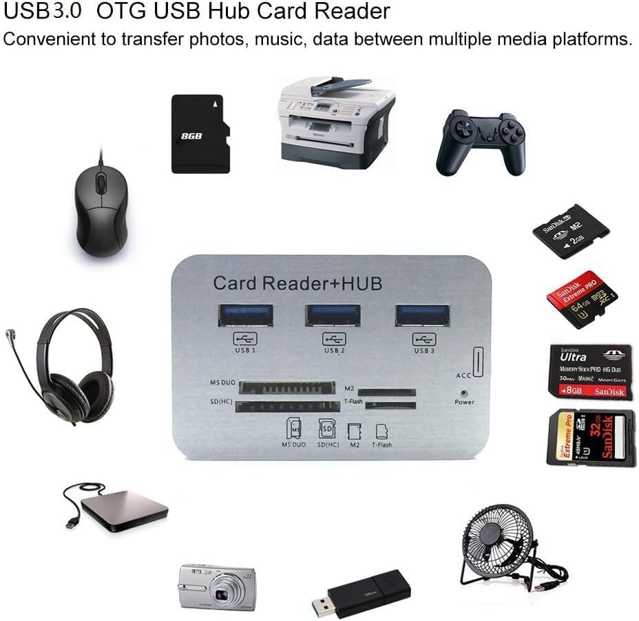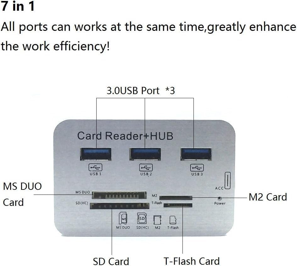 - USB3.0 Card Reader and 3 Ports USB Hub, High Speed External Memory Card Reader (MS, Micro SD,SD/MMC,M2,TF Card)
