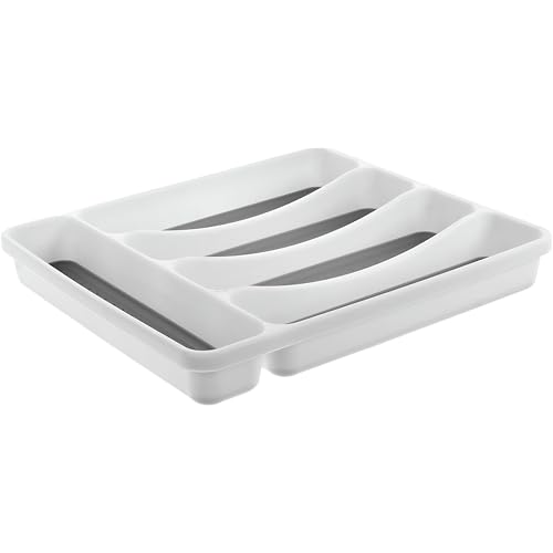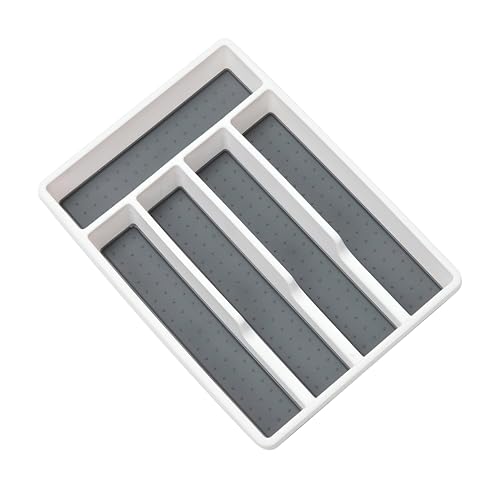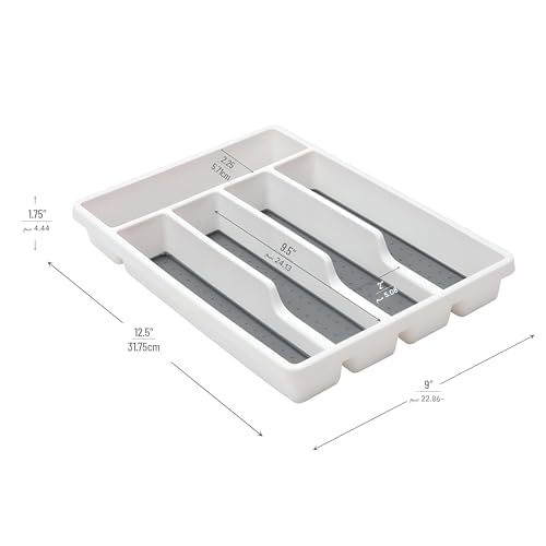- This five-compartment cutlery organizer is designed with five distinct storage bays for knives, forks, spoons, and utensils, finished in a two-tone white-on-gray style, and sized at 9 inches long by 12.5 inches wide and 1.75 inches high to fit standard or smaller drawers, with a non-slip base to keep utensils secure.