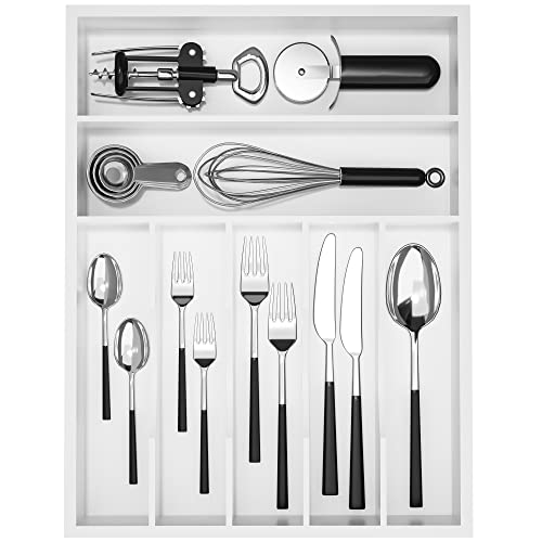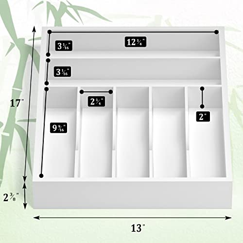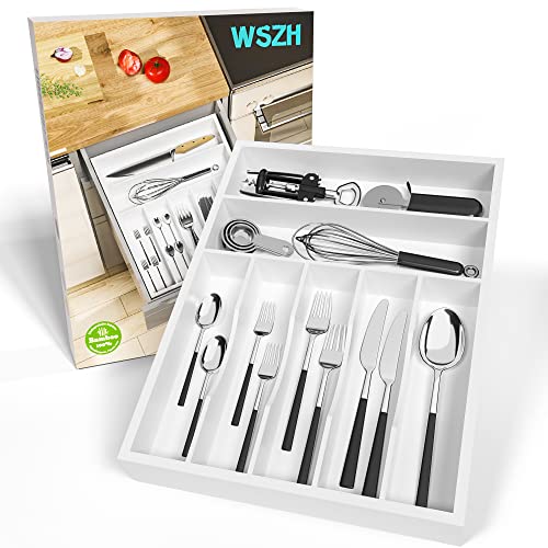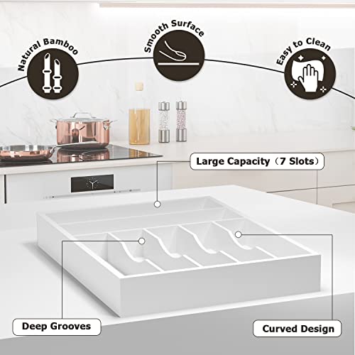 WUSHIZHUHUN - Utensil Organizer Silverware Drawer Organizer - 7 Slots Bamboo Cutlery Organizer Multi-Purpose Silverware Divider for Kitchen Flatware, Hair Accessories, Repair Tools, Art Set W13”x L17” (White)