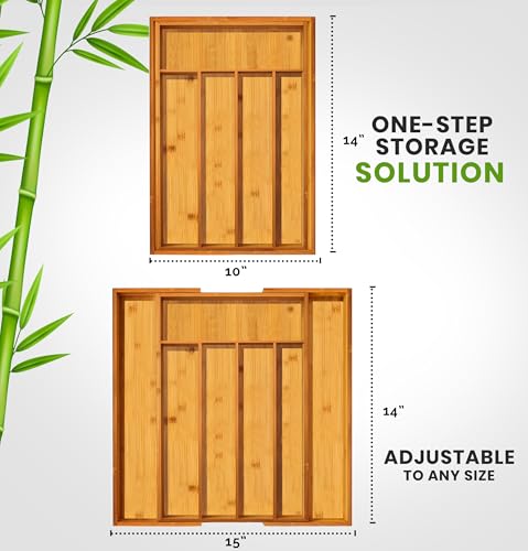- Adjustable Capacity (5-7 Slots) And Size (15x14 inches to 10x14 inches) - The organizer expands from 10"x14" to 15"x14" with 5-7 compartments, providing ample space for kitchen utensils, cutlery, and essentials. Perfect for optimizing kitchen cabinet storage. This adjustable drawer insert is ideal for those looking to optimize their kitchen cabinet organizers and storage solutions, accommodating different drawer sizes and helping to maintain an organized kitchen.