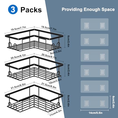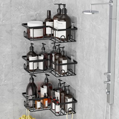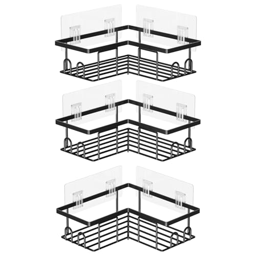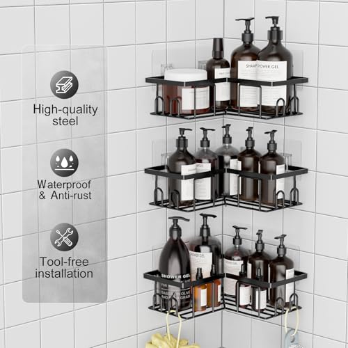 UUlioyer - Corner Shower Caddy Set 3-Pack, Shower Shelf No Drilling, Bathroom Corner Shelves, Adhesive Shower Storage Rack with 12 Hooks, Bathroom Storage Accessories (Black)