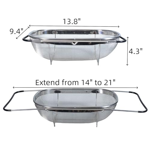 - 【Universal Fit】 : The fine mesh strainer designed with sturdy rubber grip handles that can extend from 14" to 21", making it suitable for most sinks.