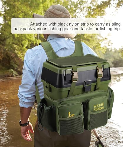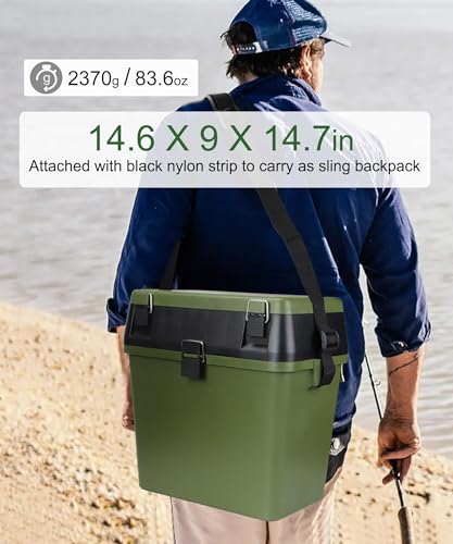 - Tackle Box Large: 14.6 X 9 X 14.7in, tons of storage inside tackle box organizer to store assorted fishing gear you need, attached with black nylon strip to carry as sling backpack.