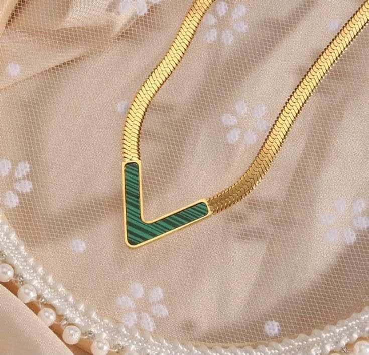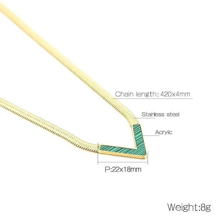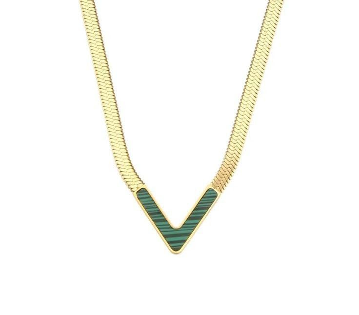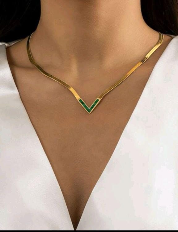 Generic - عقد مطلي بالذهب على شكل حرف V مع ترصيع مالاكيت الاخضر، سلسلة متعرجة
