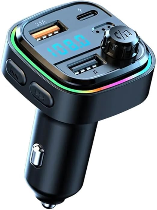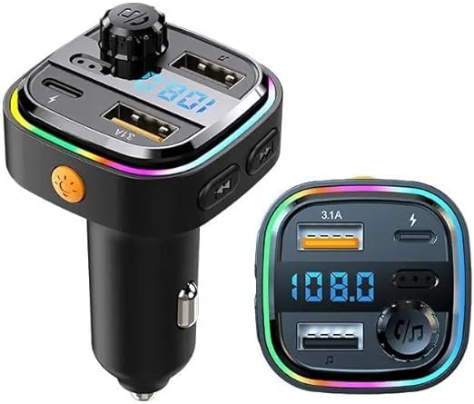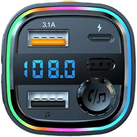 V Volt - شاحن سيارة من V Volt متعدد الوظائف 15W + 15W مع FM وشحن سريع، شاشة رقمية LED، إضاءة ملونة، 3 منافذ USB-A وType-C، ناقل صوت FM، متوافق مع جميع السيارات.