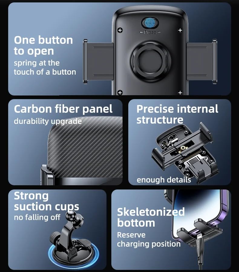 - [سهل الاستخدام بيد واحدة]: يتميز بتصميم ذكي يتيح لك تثبيت هاتفك أو نزعه بيد واحدة فقط، مما يمنحك تحكمًا كاملاً دون أن تُشتّت تركيزك أثناء القيادة. مناسب للرد على المكالمات أو استخدام GPS بسهولة.