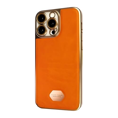 V Volt - V Volt Luxury Compatible with iPhone 14 Case, Stylish Design Leather Back Cover with Gold Plated Frame, Slim Shockproof Cover with Raised Camera Protection for Men Women (Orange)