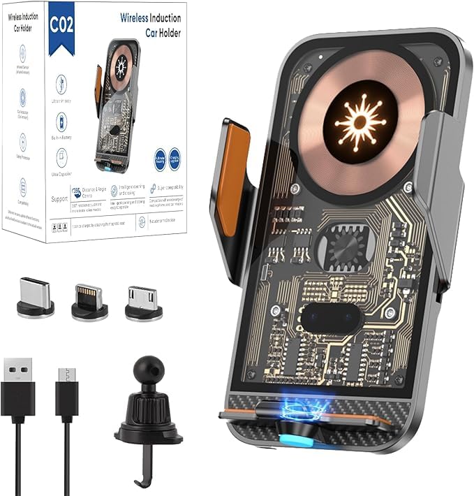- [Carbon Fiber Style Clear Design]: This carrier features a unique transparent design with carbon fiber accents that add a sporty and stylish touch to your vehicle. Combines style with technology to create an eye-catching in-car piece, reflecting the elegance for fans of excellence in the detail.