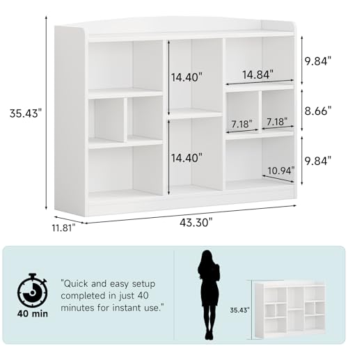 - 🌳【Safety Arc Guardrail & Thicked Base】 The edges and corners of this book/toy cube storage organizer are smoothly rounded to prevent any wood shavings or sharp corners that could hurt you and your child. The bottom is raised to prevent books or toys on the lower shelf from getting dirty. With an overall height of 35.43'' and an interior depth of 11''.