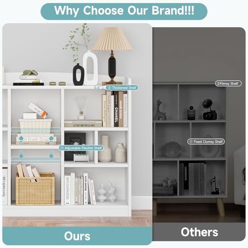 - 🌳【Adjustable Height Shelf】 Our bookshelves are flexible and adjustable, you can adjust the height of the middle compartments according to your favorite, there are 3 heights to choose from, so tall books/toys, artwork or storage boxes can easily fit into this shelf!