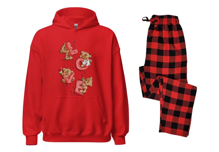 Generic - Valentine's Day Pajama Set, Red Hoodie with Teddy Bears, Plaid Pants, 2-Piece Size (M)