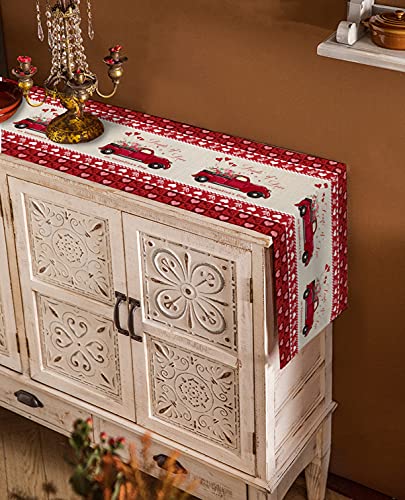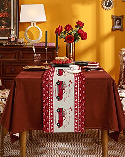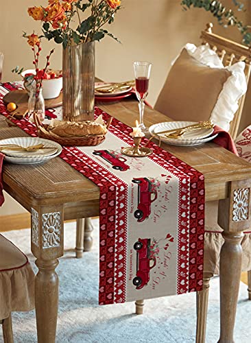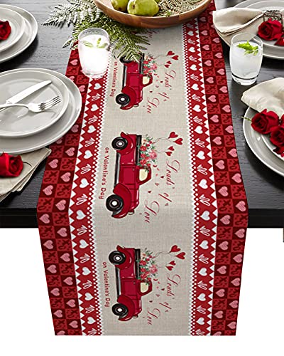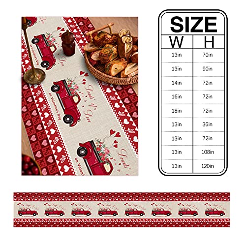 Daleng - مفرش طاولة بتصميم شاحنة لعيد الحب مقاس 13 × 70 انش بتصميم شاحنة حمراء من الخشب المحبب ومضاد للانزلاق لتزيين طاولة عيد الحب والذكرى السنوية وحفلات الزفاف