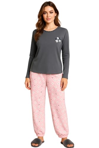 VNL by Vanilla - طقم بيجامة للنساء بطبعة زهور من فانيلا، بلوزة رمادية باكمام طويلة مع بنطلون منقوش باللون الزهري، ملابس نوم كاجوال كود 3437