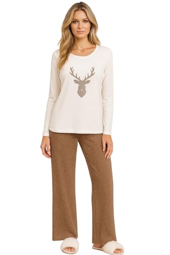 VNL by Vanilla - Vanilla Women's Winter Loungewear Set, Long Sleeve Deer Print Top with Brown Leopard Print Pants, Casual Sleepwear Pajama Set Code 3434