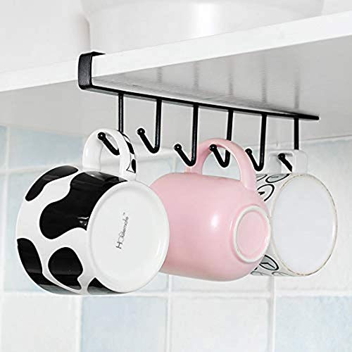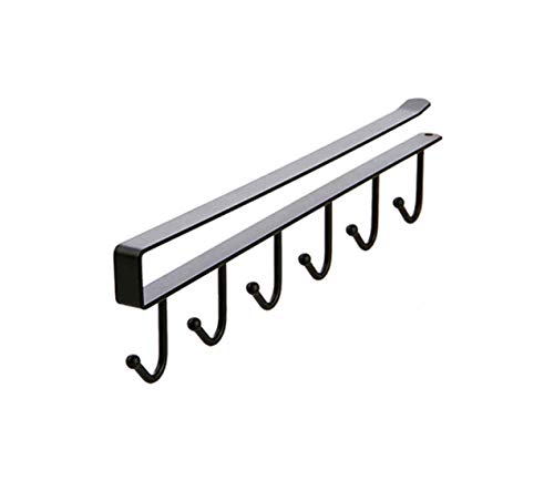 Vaoza - رف من الفولاذ المقاوم للصدأ بـ6 خطافات تحت رف الخزانة من فاوزا لتعليق أكواب القهوة، والماجات، والكاسات، ومفاتيح الشماعات، والأحزمة والسكارفات، منظم وأدوات مطبخ، دون مسامير، (1، أسود)