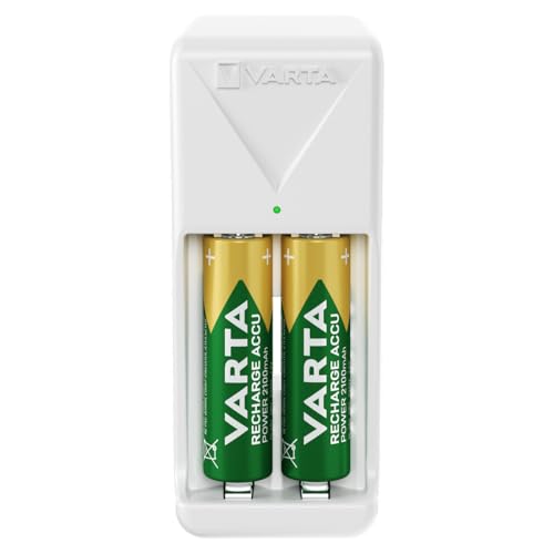 Varta - VARTA Battery Charger Includes 2 x AA 2100 mAh Battery Charger for Rechargeable Batteries Charges 2 AA/AAA Simultaneously, Mini Charger, White