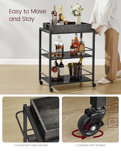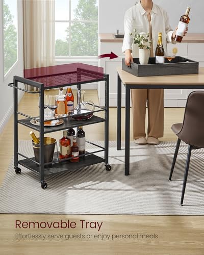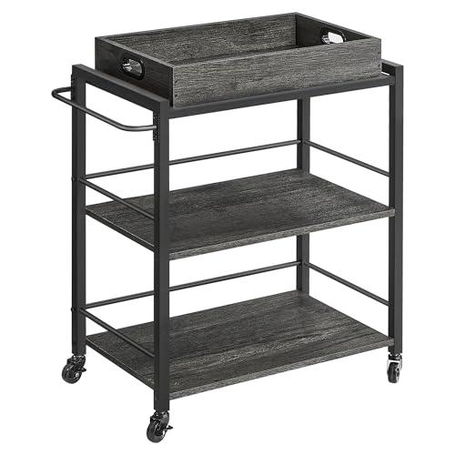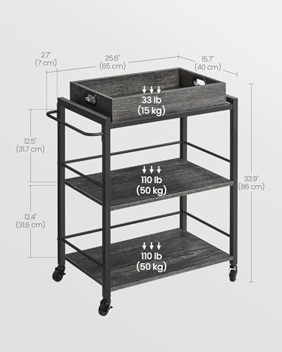 VASAGLE - عربة تقديم المطبخ من فاساجيل مع صينية قابلة للإزالة، عربة لأدوات المطبخ ثلاثية الأرفف بعجلات مع إمكانية تخزينها وفرامل وأرجل مستوية، مقاس 40 × 72 × 86 سم، رمادي فحمي وأسود، موديل ULRC072B04