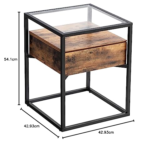 VASAGLE - VASAGLE Tempered Glass Side Table, Nightstand, with Drawer and Shelf, Decoration in Living Room, Stable Steel Frame, Industrial, Rustic Brown