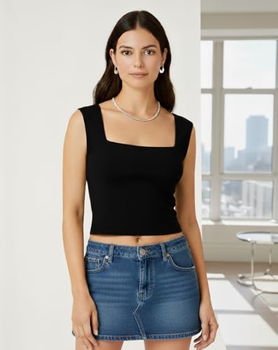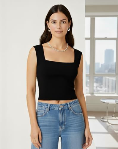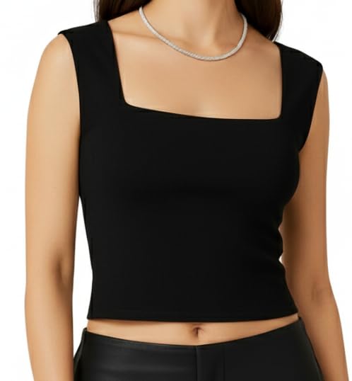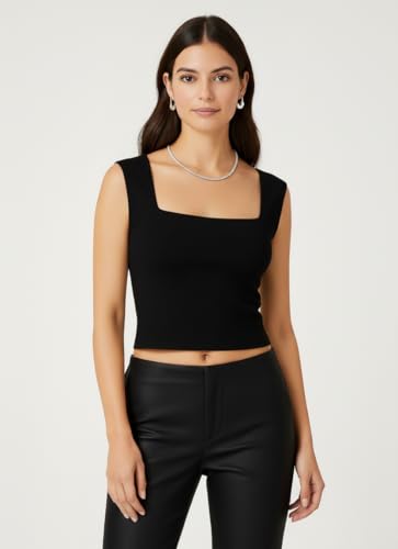 Generic - توب قصير بدون اكمام برقبة مربعة للنساء، تانك كاجوال قابل للتمدد