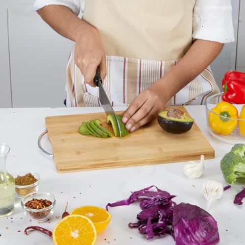 - لوح تقطيع خشبي: تم تصميم لوح التقطيع الخشبي 2 في 1 ذو الوجهين بسطح أملس تمامًا لإعداد الطعام اليومي، بدءًا من تقطيع الخضروات إلى تقطيع الفاكهة أو تقطيعها. يمكن استخدامه أيضًا كطبق تقديم لخدمة أصدقائك وعائلتك. سيكون التصميم الجميل مكملاً مثالياً لأي مطبخ.
