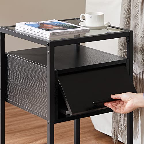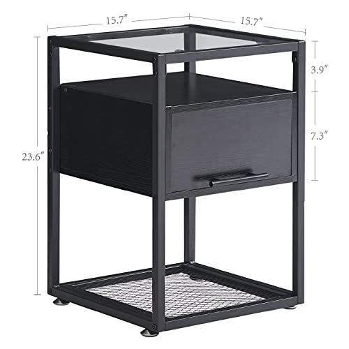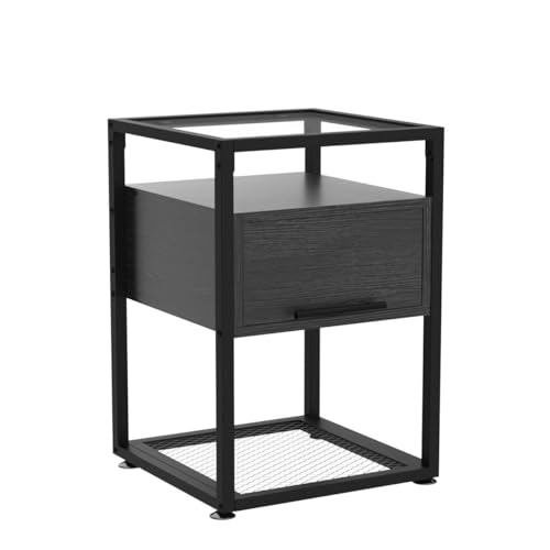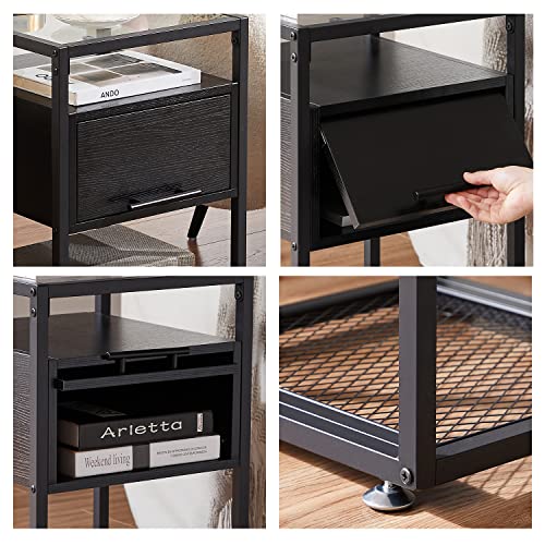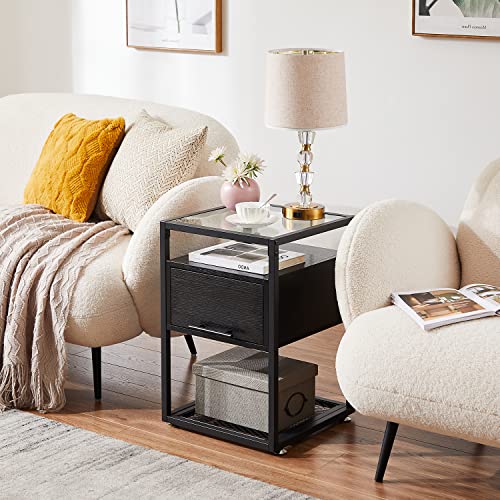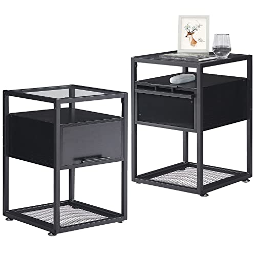 VECELO - طاولة جانبية مع درج قابل للطي من فيسيلو رف تخزين مفتوح واطار ستيل ثابت اثاث بجانب السرير الزجاج المقوى لغرفة النوم وغرفة المعيشة مجموعة قطعتين أسود خشب هندسي المقسى