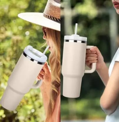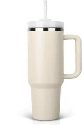 ved online mart - 1200ml Stainless Steel Tumbler, Double Insulated Hot & Cold Mug with Handle, Lid & 1 Straws, Cupholder Friendly, Ideal for Gym, Travel & Daily Use (White, Matt)