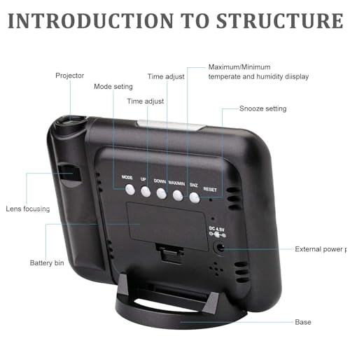 - 180° projection alarm clock: the projection alarm clock provides a clear view of the time on your ceiling or wall with 180° rotating projector, and can be adjusted 180° forward and reverse time projection by long pressing the "projection" button.