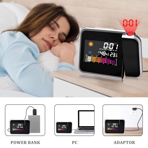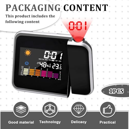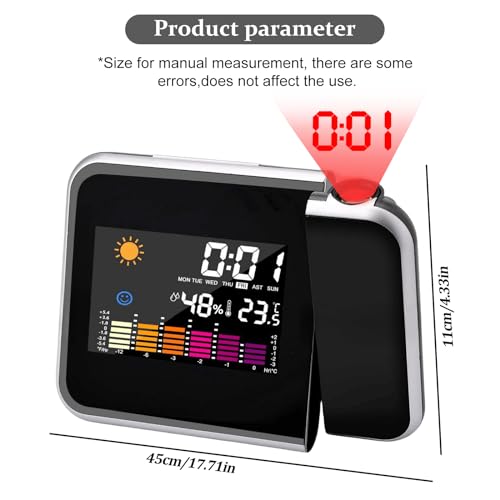 - Multifunctional projection alarm clock: time, day of the week, temperature, humidity and upcoming weather. The coloured LCD display screen of the projection alarm clock makes the whole screen beautiful and makes all data clearly displayed.