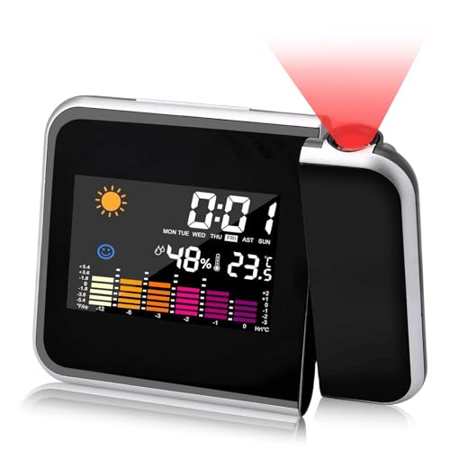 - LED digital alarm clock: projection alarm clock with just one touch of the light button, you can turn the backlight on or off, which allows you to easily read the time even at night. Temperature display in °C and °F, humidity, forecast pictograms and a snooze mode with min/max function.